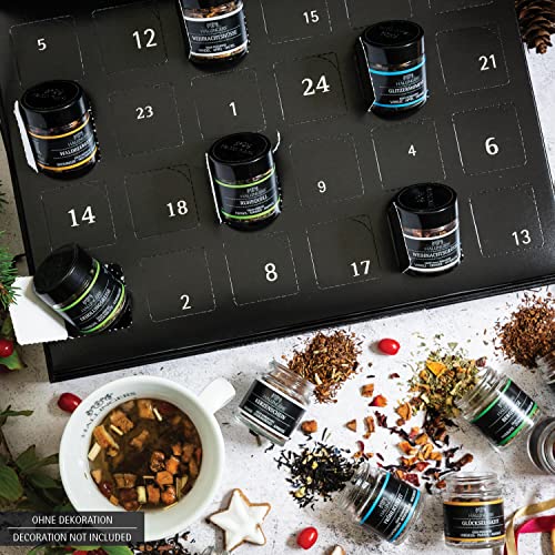Perfektes Geschenk zum Advent für alle Tee-Genießer und Tee-Gourmets – 24 feine Tee-Sorten aus aller Welt, in wiederverschließbaren sowie aromadichten Minigläsern von Hand abgefüllt, versiegelt und verpackt Edle Optik, höchster Genuss und Orginalität. Was braucht ein Geschenk mehr, um den liebsten oder guten Freunden ein strahlen ins Gesicht zu zaubern? Eine Prise Liebe. Dieser Adventskalender besteht aus 24 mit Liebe ausgewählten und von Hand abgefüllten Teemischungen aus aller Welt. Die speziellen, wiederverschließbaren und nachfüllbaren Gläschen erfreuen nicht nur das Auge, sonderen bewahren auch besonders lange das feine Aroma ihres Inhalts. Jede Deluxebox wird in unserer Manufaktur konfektioniert. Das edle Design der Verpackung macht dieses Sammlung feinster Tees zu einem ästhetischen Hingucker und ist ein perfektes, hochwertiges und originelles Geschenk – im Advent, zu Weihnachten, zu besonderen Anlässen oder einfach so für einen ganz besonderen Menschen. Die enthaltenen Genüsse entnehmen Sie bitte der Übersichtskarte bei den Artikelbildern. Beachten Sie aber bitte, dass es hier explizit zu Anpassungen kommen kann!