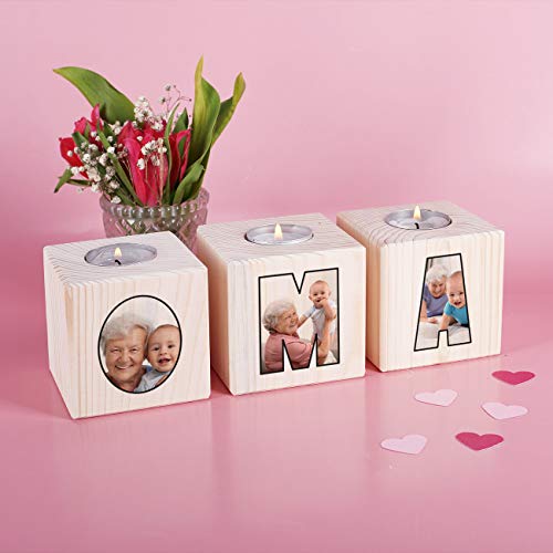Das Set besteht aus 3 Teelichthaltern aus Holz in Würfelform. Diese werden auf einer Seite mit Buchstaben bedruckt, welche zusammengestellt das Wort OMA ergeben. In jeden einzelnen Buchstaben wird ein Foto von Ihnen integriert. Dafür benötigen Sie 3 Fotos von schönen Momenten mit der Oma, niedlichen Bildern der Enkel oder Familienportraits.