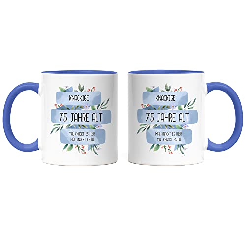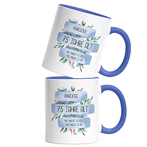 Details: Hey!Print Knackige 75 Jahre Alt Tasse Blau Humorvoll Spruch-Tasse Mal Knackt Es Hier Geschenkidee 75. Geburtstag