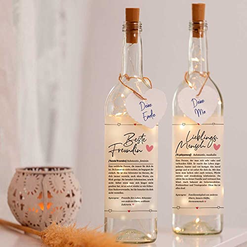❤️ VON HERZEN: Himmelsflüsterer Flaschenlicht Nr. 1 „Definition“ BESTE FREUNDIN als LED Deko für ein Wohnzimmer oder Schlafzimmer. Unsere Lichterflaschen sind ideale Geschenke für beste Freundin. Bei Dunkelheit spendet die galante Flasche ein warmes Licht und sorgt für ein angenehmes Wohlgefühl. Ein- und ausgeschaltet wird das Flaschenlicht über einen Schalter im Flaschenkorken, Batterien sind bereits enthalten und lassen sich auch einfach wechseln.