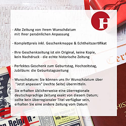 Geben Sie Ihr Wunschdatum an (rechte Spalte) und erhalten Sie eine der über 5 Mio. Original-Geburtstagszeitungen aus unserem Zeitungsarchiv. Wir senden Ihnen eine echte Zeitung exakt von Ihrem Wunschdatum zu. Im Normalfall erhalten Sie eine überregionale deutschsprachige Zeitung. Sollte einmal kein überregionaler Titel vorhanden sein, senden wir Ihnen eine andere deutschsprachige Zeitung zu.