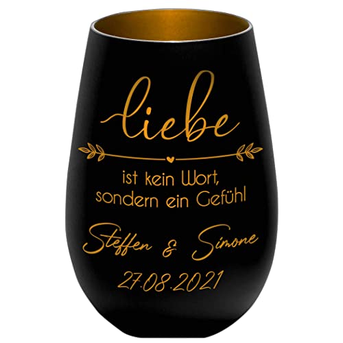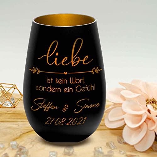 Details: Hochzeitsgeschenk – Windlicht – Liebe ist kein Wort sondern EIN Gefühl – Schwarz/Gold – personalisierbar – Gravur Namen…