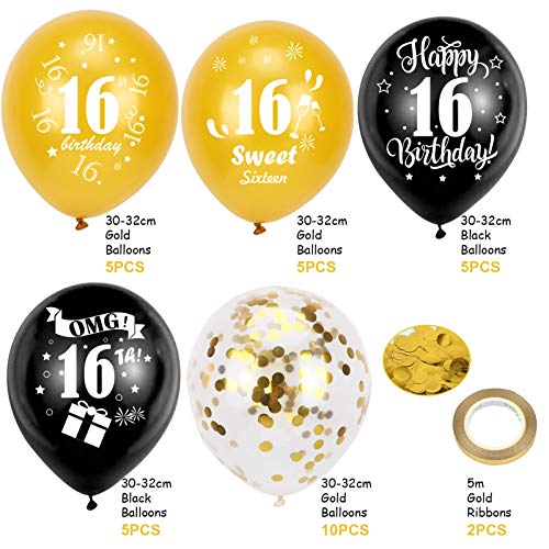 30 Stück Schwarz gold 16. Geburtstag Luftballons : Sie erhalten 20 Stück 16. Geburtstag Latexballons, 10 Stück gold Konfetti ballons,Es wird auch mit 2 Rollen gold bändern geliefert, die ausreichen, um Ihre Geburtstagdeko bedürfnisse zu erfüllen.