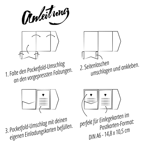 ► ► ► BEFÜLLEN: Viel Platz zum Gestalten, für Einleger, Informationen und Dekoration. Problemlos zu beschriften. Für Einladungskarten, Weihnachtskarten, Hochzeitskarten, als Bastel-Karton, uvm… Es gibt 1000 Anlässe für eine Pocketfold-Karte.