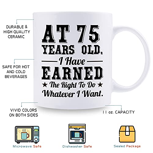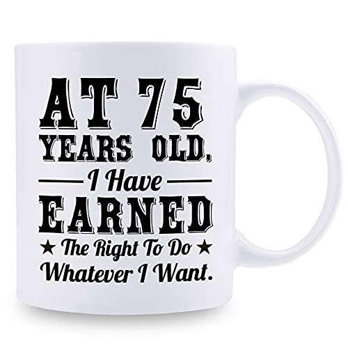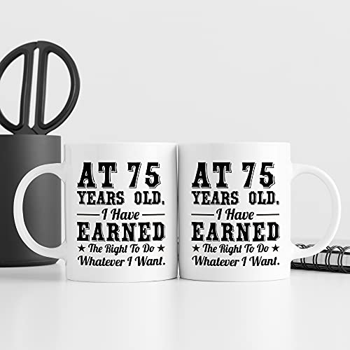 💖 Bestes Geschenk zum 75. Geburtstag – Der Spruch At 75 Years old, I Have EARNED The Right To Do Whatever I Want. auf beiden Seiten der Tasse 75. Geburtstag bedruckt. Tasse zum 75. Geburtstag ist eine tolle Geschenkidee für Oma und Opa, die bald ihre 75 Jahre alt feiern wird. Diese Tasse ist ein Vintage-Geburtstagsgeschenk für ältere Männer und Frauen, das sie zum Lachen bringen wird.