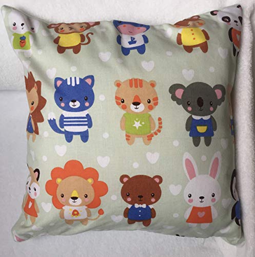 Farbenfrohe Kissen sind schon für kleine Kinder interessant und beliebt. Dieses lustige Kinder Kissen mit Tiermotiven regt die Phantasie und somit zum Spielen an. Auch für längere Autofahrten ein kuschlige Begleiter. Wendekissen-Rückseite grüner Baby- Fleece. Bezug: Vorderseite: Baumwolle, Reisverschluss. Innenleben, Mikrofaser 100% Polyester, ca.150g Faserbällchen 100% Polyester , waschbar bei 40° Größe: 30cmx30cm.