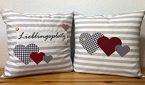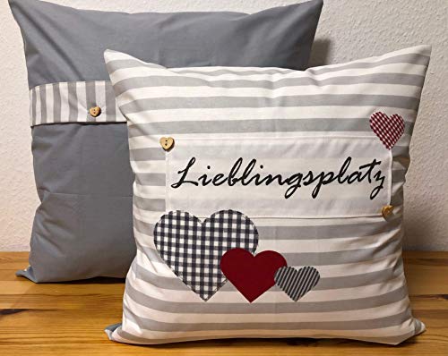 Herzlich Willkommen bei Handmade by AMMERKIND HOME DEKO und ACCESSOIRES vom AMMERSEE 1x Landhausstil Kissenhülle Kissenbezug * Lieblingsplatz * grau / weiß gestreift mit Herzen, Verschluss: Knopfleiste mit Holzknöpfen 100 % Handarbeit Größe ca. 40x40cm. oder 50x50cm. 100% Baumwolle Landhaus Design für ein gemütliches Zuhause. Zu diesem Artikel gibt es auch das passende Kissenbezüge, Tischläufer, Platzdecken, Brotkörbchen in unserem Shop . Wenn sie sich für einen bestimmten Artikel interessieren und Fragen dazu haben lassen sie es uns einfach wissen. Lieferung ohne Dekoration! Hinweis: Ihr Bestellung wird erst nach Auftragseingang individuell für Sie gefertigt.