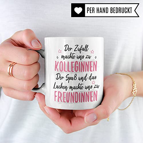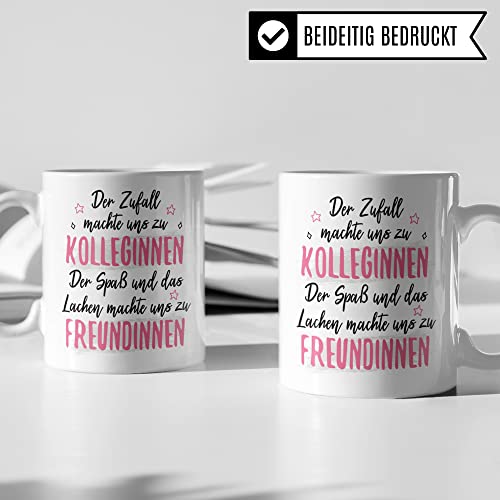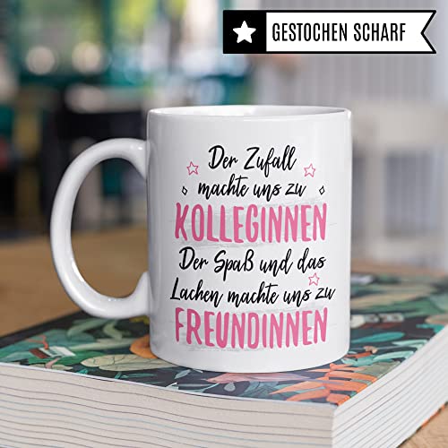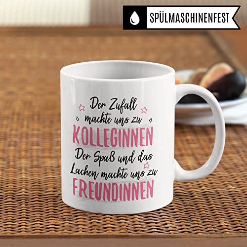 DER ZUFALL MACHTE UNS ZU KOLLEGINNEN DER SPASS UND DAS LACHEN MACHTE UND ZU FREUNDINNEN! Witzige Büro Tasse aus weißer Keramik mit Kollegin Spruch. Das ideale Geschenk für Kollegin Geburtstag, Abschied, Rente & Weihnachten! Garantiert spülmaschinenfester Aufdruck – mit hochwertiger Sublimationstechnik bedruckt und deshalb besonders robust. Alle unsere Tassen werden zu 100% in Deutschland, zu fairen Bedingungen und mit Liebe bedruckt. Das ideale Geschenk, egal ob die Tasse als Kakaobecher, Kaffeetasse oder Kaffeebecher genutzt wird.