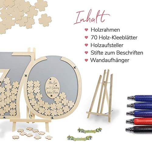 VIELE EXTRAS: Sie erhalten eine Staffelei, zwei Wandaufhänger, fünf spezielle Stifte und 70 Holz-Kleeblätter zum Beschriften.