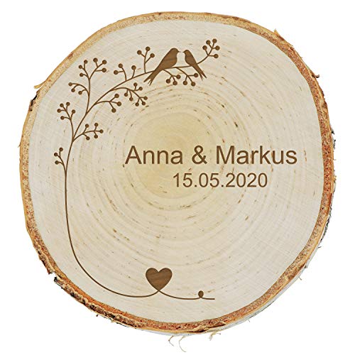 Individuell zur Hochzeit gravierte Baumscheibe aus Birken-Holz mit schönem Vogel-Pärchen Motiv. Personalisiert wird die Holz-Scheibe mit den Namen von Braut & Bräutigam sowie dem Hochzeits-Datum