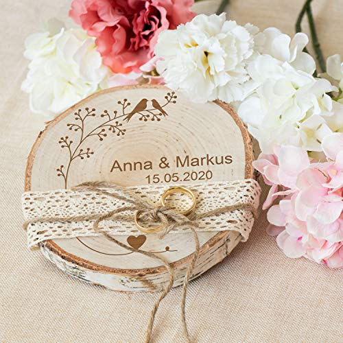 Details: LAUBLUST Baumscheibe Personalisiert zur Hochzeit – ca. 18 cm, Vogelpärchen Motiv | Ringkissen | Hochzeitsgeschenk & Deko