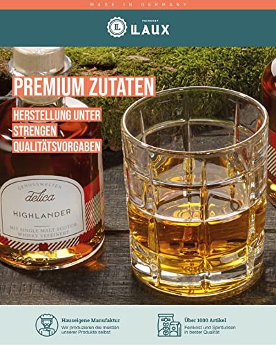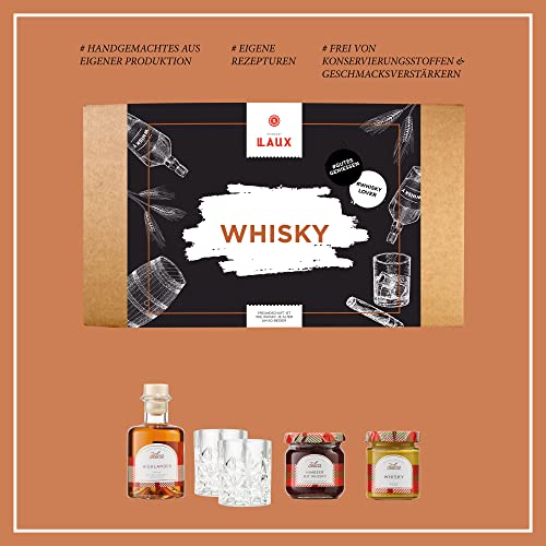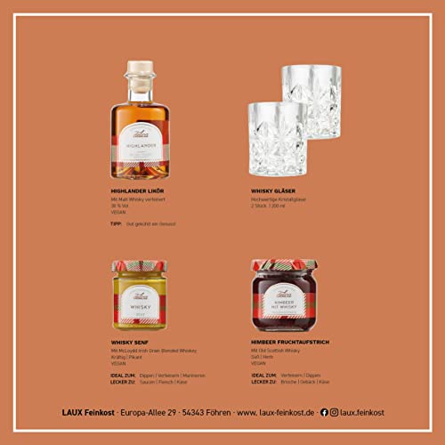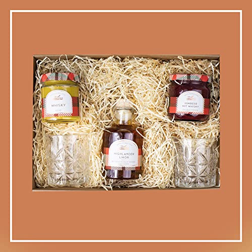 🎁 GOURMET-FEINKOST: Das perfekte Set um einfach mal Danke zu sagen, beinhaltet Delica Highlander Likör mit Scotch Malt Whisky, 2 hochwertige Whisky-Gläser, Delica Whisky Senf und Delica Himbeer Fruchtaufstrich mit Whiskey