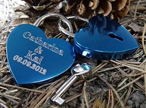 Das Schloss ist rundum aus hochglänzemdem Metall, dessen Oberfläche hochwertig eingefärbt wurde. Durch dieses Verfahren wird der Glanz und die Farbschicht des Schlosses sehr widerrstandsfähig. Der Korpus des Schlosses ist auf beiden Seiten flach und frei von Logos oder Schriftzügen – ausser natürlich Deiner Gravur. Zum Schloss selbst erhälst Du noch einen passenden Schlüssel, der mit einem Herz-Kopf versehen ist. Farbe: Gold, Rosé-Gold, Antik-Gold, Silber, Rot, Pink, Lila, Blau, Grün, Schwarz Symbole: Herzen, Ringe, Unendlich, Anker Oberfläche: Hochglänzend Gravur: Diamantgravur Maße: 60 x 45 x 8 mm