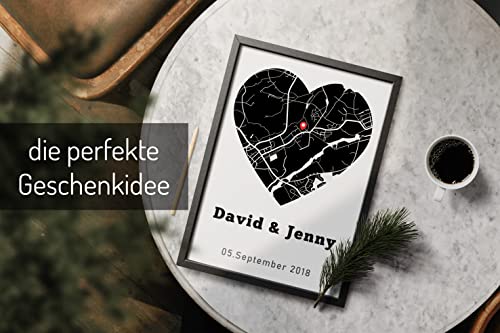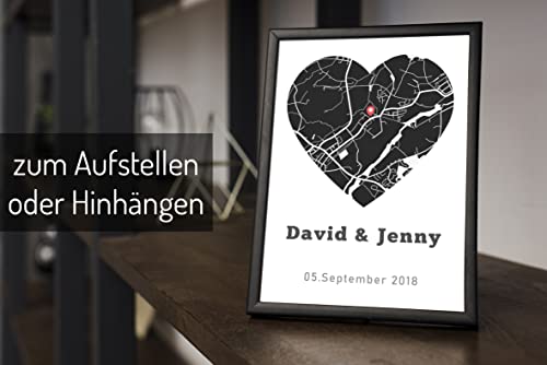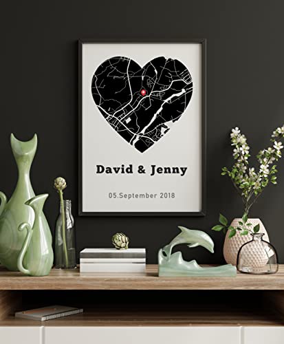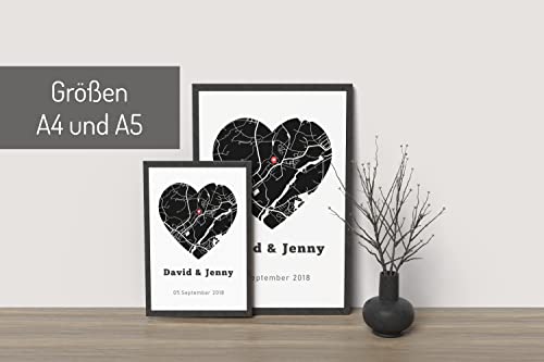 Das Poster wird von uns mit Euren ganz persönlichen Kennenlerndaten bedruckt. Der Ort ist als Karte in Herzform dargestellt und wird begleitet von Euren Namen und dem Datum Eures Kennenlernens. Das stilvolle Design ist ein absoluter Blickfang in jedem Zuhause – ob im Wohnzimmer, Schlafzimmer oder an dem Ort Eurer Wahl. Das Poster ist in den Größen A4 oder A5 erhältlich und kommt mit einem passenden Rahmen, der entweder aufgestellt oder aufgehängt werden kann.