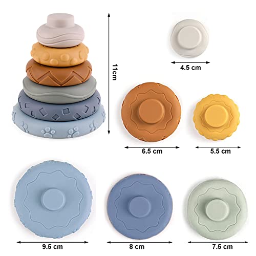 【Eine Vielzahl von Spielmöglichkeiten】 Süßen Stapelkreise können nach den Vorstellungen des Kindes gebaut oder der Größe entsprechend gestapelt werden, damit das Baby lernen kann, nach Größe zu sortieren. Darüber hinaus kann es auch als Beißring für Babys verwendet werden, der weich und langlebig ist. Wenn Sie auf den Kreis drücken, quietscht das Spielzeug, was die Hörentwicklung Ihres Babys fördert.