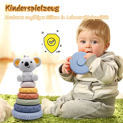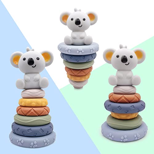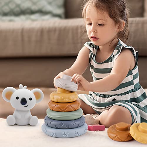【Stapeln Spielzeug】Das stapelbare Beißspielzeug hat sechs Kreise in verschiedenen Größen und ein sehr süße Koala oben drauf. Das bonbonfarbene Aussehen, lustige Geräusche können die Aufmerksamkeit des Babys erregen, und die ungleichmäßigen Muster und Muster auf der Oberfläche helfen Kindern, ihren Tastsinn zu entwickeln. Ein unverzichtbares Spielzeug für Babys!
