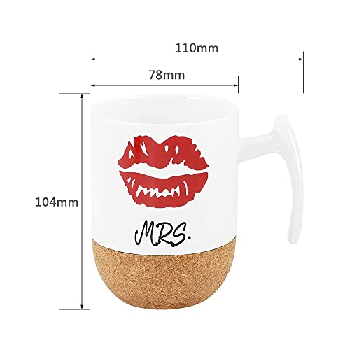 Stilvolles Aussehen: Keramik Kaffeebecher mit Mr. & Mrs. Aufschrift und Schnurrbart & Kussmund Muster sowie Korkboden. Es ist einfach, lustig und elegant