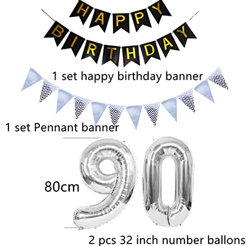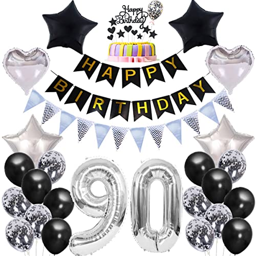 🎈90. Geburtstags dekorationen set: 1 set „Happy Birthday“ Banner, 1 x Silber Wimpel Banner(12pcs) ,2 x 18“ Liebe Herz Folienballons, 2 x 18“ Star Folienballons,2 x 18“ Schwarz Star Folienballons, 2 × 32“Digital Silber“90″ Folienballons, 8 x 12“Konfetti Ballons, 8 x 12“ Schwarz Latex Ballons,1 x Band.1 pcs Happy Birthday Torten Topper + 4 pcs 4cm Sternen Topper, 1 pcs 3cm Sternen Topper ,2 pcs 4cm herz Topper + 2 pcs 3cm herz Topper ,1 pcs Schwarz Konfetti Luftballons mit Ständer.