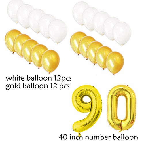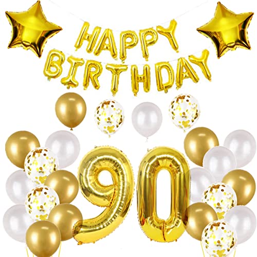 90. Geburtstags dekorationen gold set: 13 x Rose Gold „Happy Birthday“ Banner, 2 x 18“ Star Folienballons, 6 x 12“ Konfetti gold Ballons, 8 x 12“ Gold Latex Ballons ,8 x 12“ Weiß Latex Ballons , 1 x Band, 32“ Digital „90“ Folienballons,