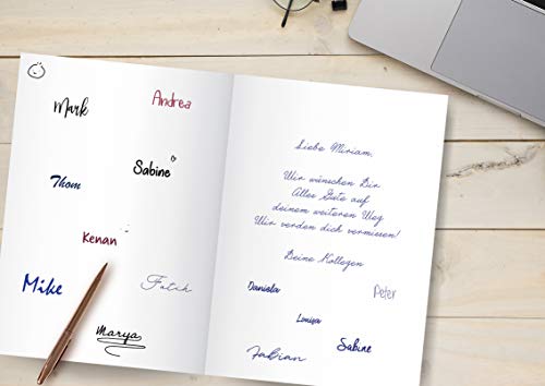 VIEL PLATZ – Die große DIN A4 Abschiedskarte mit den Maßen 21 x 29,7 cm bietet genug Platz für zahlreiche Unterschriften aller Arbeitskollegen.