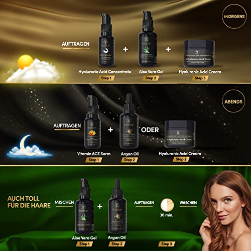 VEGANE BIO NATURKOSMETIK AUF BIO ALOE VERA BASIS – Anstatt wie andere Hersteller wirkungsloses Wasser als Hauptinhaltstoff zu nutzen, verwenden wir Bio Aloe Vera, die den Produkten eine tiefpflegende, feuchtigkeitsspendende Wirkung verleiht. Die Kombination aus Hyaluron & Vitamin ACE Serum, Anti-Falten Creme, Gel & Öl sorgt für eine reichhaltige Pflege Deiner Haut. Geeignet für Männer & Frauen & jeden Hauttyp. BESTMÖGLICHE PFLEGE für Haut, Hals, Augen & Gesicht.