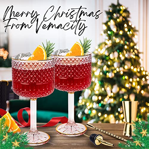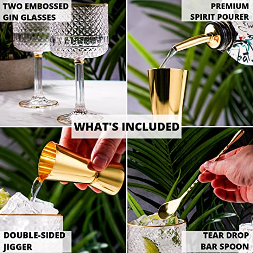 Luxuriöse Gin-Gläser für Gin-Liebhaber, 2 Stück geprägte G&T-Gläser mit Golddetails | Gold-Cocktaillöffel, Doppel-Spirituosenmaß & Spirituosen-Ausgießer Große Cocktailgläser in Geschenkbox, Weihnachtsgeschenke