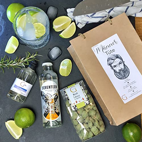 Das ultimative Männer-Geschenk für echte Kerle! Alles was ein Mann braucht in einem Set – Gin Tonic Genuss PUR! Ein ideales Geschenk oder Mitbringsel für einen gelungenen Männerabend oder als Geburtstagsgeschenk. Einfach Gin und Tonic mischen und evtl. etwas Eis hinzufügen. Das passende Knabberzeug für heiße Jungs ist inklusive. Im Männer-Paket enthalten: ✔️ beste Genial Genießen beyonde Gins: Gin Classic 100 ml und Gin Orange 100ml ✔️ hochwertige Tonic Water zum Mischen: Seventeen 1724 Tonic Water 200ml und Thomas Henry Tonic Water 200ml ✔️ Außergewöhnlicher Gin Genuss: GeGeGe Gin Tonic Sirup 100ml, Gin Tonic Fruchtgummis 50g, Cuba Libre Fruchtgummis 50g, leckere Wasabi-Erdnüsse im Teigmantel 150g zum Snacken