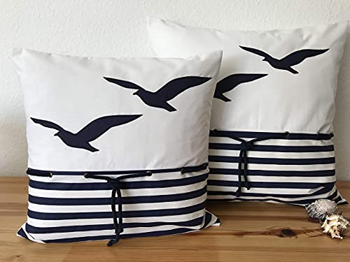 Details: 1 Maritime Kissenhülle, Kissenbezug,Landhausstil Kissen *Möwen blau* Kissen weiß/weiß/blau gestreift