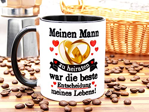 Weiße Tasse mit schwarzer innen Farbe und Henkel mit dem Spruch „Meinen Mann zu heiraten war die beste Entscheidung meines Lebens!“ – Höhe: 9,5 cm – Ø 8,3 cm – Gewicht: 340 Gramm – Volumen: 330ml – Material: Keramik – Geschirrspüler & Mikrowellen geeignet.