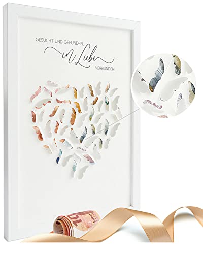 🌟 PERSONALISIERBAR: Ihr habt die Möglichkeit zwischen zwei verschiedenen Texten zu wählen. Wir haben das Bild so gestaltet, dass ihr unten noch genug Platz für eure Wünsche oder die Namen des Brautpaars habt. Die Schmetterlinge werden einfach aufgeklappt und Ihr könnt dahinter nach Lust und Laune eure Geldscheine positionieren. Durch das Aufklappen der Schmetterlinge hat das Bild eine tolle 3D-Optik, die das Brautpaar lieben wird. Ein Geschenk, das definitiv auffallen wird.