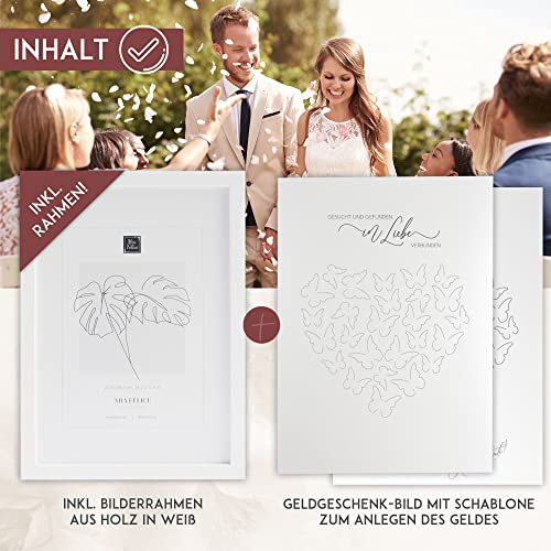 🌟 ORIGINELL: Positioniere deine Geldscheine, fixiere sie mit Klebeband auf der Schablone und erhalte im Handumdrehen ein unvergessliches Geldgeschenk in edler 3D-Optik. Da es sich um einen der wohl wichtigsten Tage für Mr. & Mrs. handelt, haben wir uns etwas ganz besonderes einfallen lassen! Ihr habt die Wahl zwischen zwei sehr hochwertigen Papiersorten (Perlmutt- oder Leinenpapier), inkl. einem edlen weißen Holz Bilderrahmen.