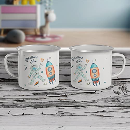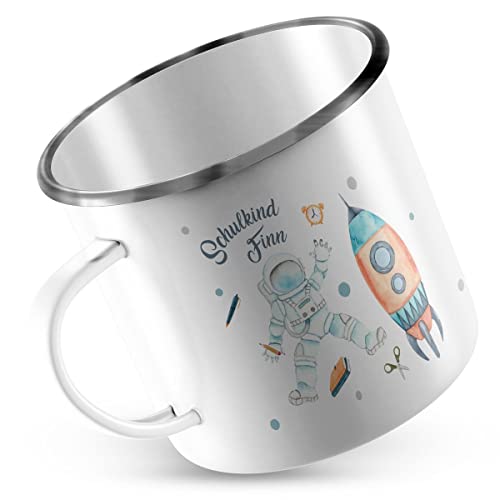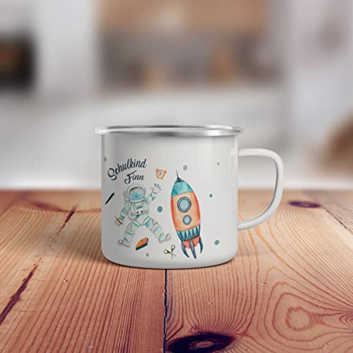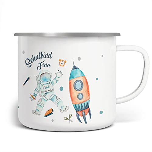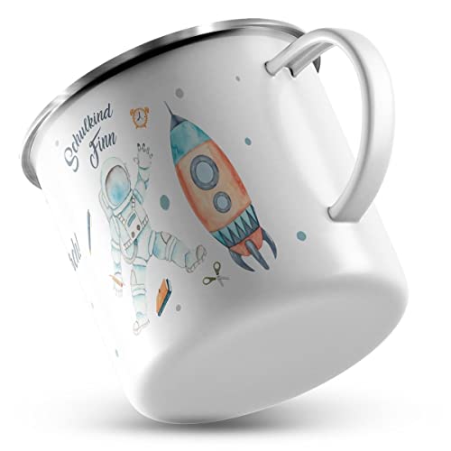 EMAILLE TASSE mit hochwertigem Aufdruck Astronaut Schulkind – ein Flug ins All personalisiert mit Wunschname – mit einem schwebenden Raumfahrer, einer Rakete, Wecker, Bücher, Schere und Stift