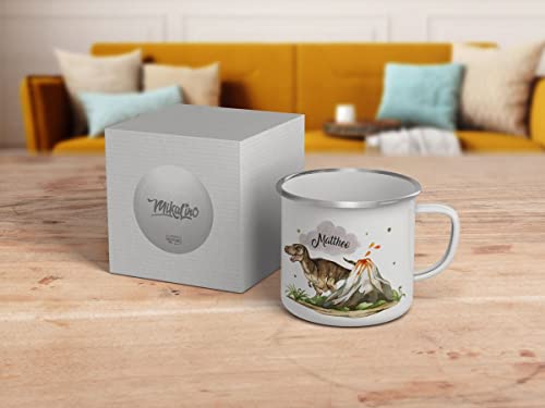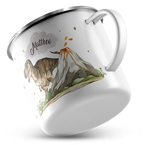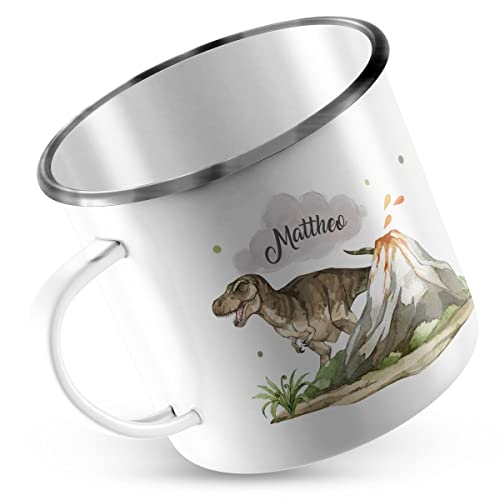 EMAILLE TASSE mit hochwertigem Aufdruck Tyrannosaurus Rex personalisiert mit Wunschname – mit einem gefährlichen T-Rex und einem Lava spuckenden Vulkan