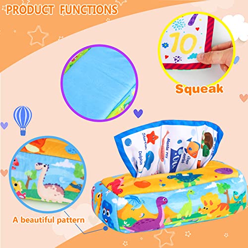 【Sensory Toy Set】Dieses farbenfrohe Taschentuchbox-Spielzeug hat ein Dinosaurierwelt-Thema und enthält eine Taschentuchbox, 8 bunte Taschentücher und 3 große Quadrate mit rasselndem Papier im Inneren, jedes mit einem anderen Design darauf, das bunte Cartoon-Muster wird die Aufmerksamkeit des Babys auf sich ziehen!