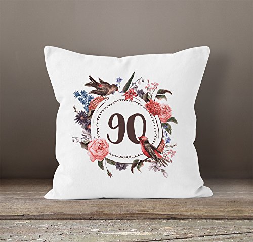 ob zum runden & vollen Geburtstag oder der geknackten Schnapszahl: diese Kissenhülle mit großer „90“ Jahreszahl und dem wunderschönen Blumen und Vögel Print von Moonworks ist eine wunderschöne Geschenkidee – besonders Frauen dürften von dieser Blütenpracht begeistert sein!