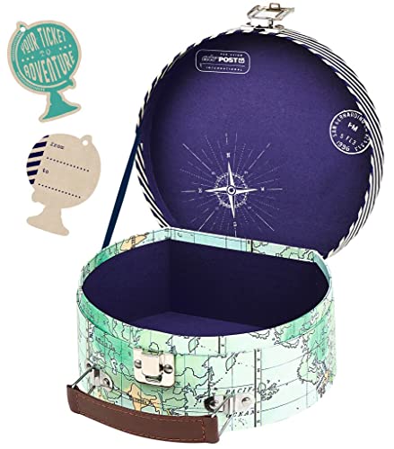Liebe zum Detail ✓ Der Miniatur-Geschenkkoffer (Maße: ca.17 x 15,7 cm x 8 cm) mit Weltkarten-Aufdruck besteht aus stabiler Pappe und hat einen Griff aus Kunstleder. Die Innenseite schmücken zudem verschiedene Länderstempel und ein alter Kompass