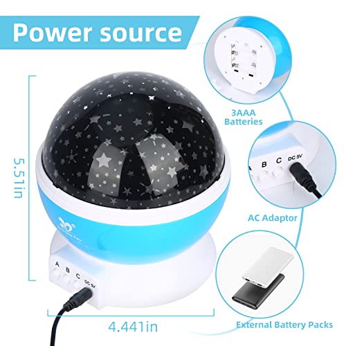 PRAKTISCH – 2 Stromversorgungsmethoden: 3 * AA-Batterien oder USB-Anschluss. Verwenden Sie das USB-Kabel und die Batterien nicht gleichzeitig (Batterien sind NICHT im Lieferumfang enthalten). Bitte nehmen Sie die Batterien aus dem Nachtlicht, wenn es nicht verwendet wird.- Mit dem Drehschalter können Sie den Nachtlichtprojektor um 360 Grad drehen, Sterne und Mond an Decke und Wand drehen lassen. Bietet einen fantastischen bewegten Sternenhimmel, romantischen Nachtlichteffekt sorgt.