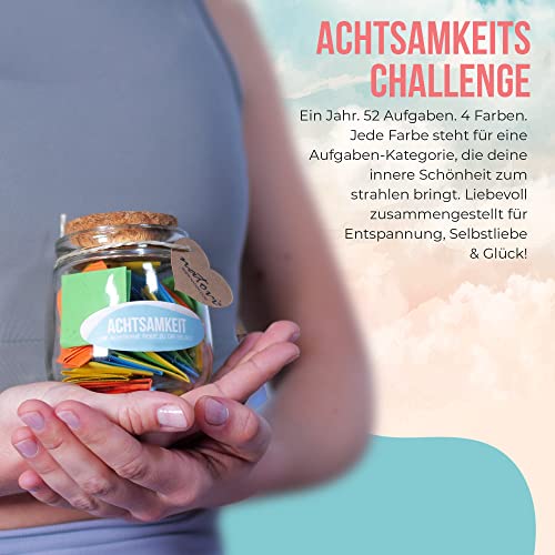 ❤️ 52 Achtsamkeitskarten im wunderschön designten Glas mit Geschenkbox. Jede Farbe steht für eine Aufgabenkategorie. Achtsamkeits Karten fördern positives Denken, Gelassenheit & Selbstliebe!