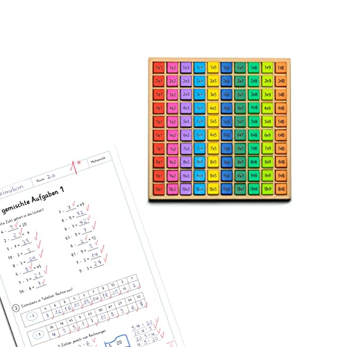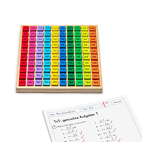Hochwertige Multiplikation Plattform & Rechenhilfe Tabelle inklusive Holzwürfel in verschiedenen Farben. Das kleine Ein Mal Eins enthält pro Baustein eine Aufgabe und eine Lösung. Die Holzbausteine sind dank des Materials robust und widerstandsfähig.