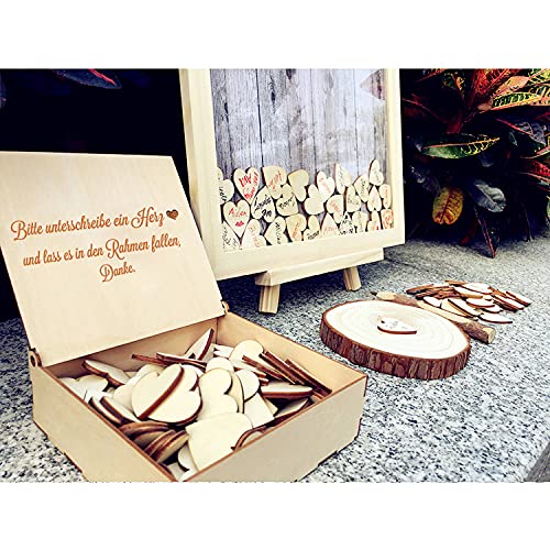 PAKET: Rahmenset +120 leere Holzherzen (die Namen und Wünsche aufschreiben können) + Holzständer + Holzstift + Holzscheibe + Kleine Holzkiste für Herzen