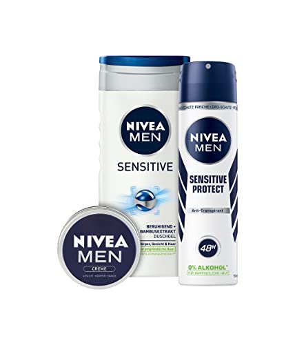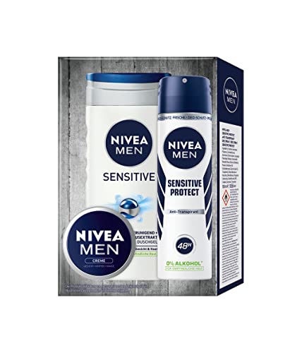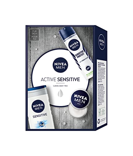Sich selbst oder die Liebsten verwöhnen mit dem NIVEA MEN Active Sensitive Geschenkset. Die NIVEA MEN Sensitive Pflegedusche pflegt und beruhigt sensible Haut und spendet bei jeder Anwendung intensive Feuchtigkeit. Das im Set enthaltene NIVEA MEN Sensitive Protect Deo Spray schützt empfindliche Haut 48h lang vor Achselnässe und Körpergeruch. Die NIVEA MEN Creme ergänzt das Set als intensive Feuchtigkeitspflege für Gesicht, Körper und Hände. Das Power-Trio für sensible Männerhaut – NIVEA Active Sensitive Geschenkset.