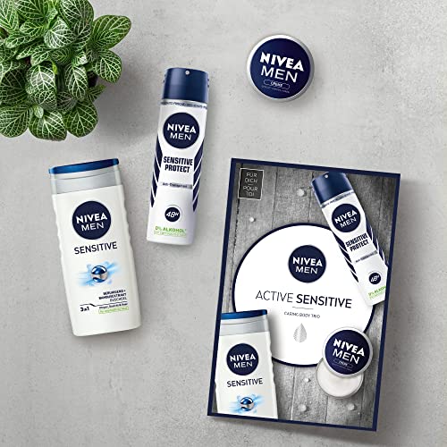 Lieferumfang & Details – NIVEA MEN Active Sensitive Set, Sensitive Duschgel (250 ml), Active Sensitive Deo Spray (150 ml), NIVEA MEN Creme (30 ml), Artikelnr. 93354