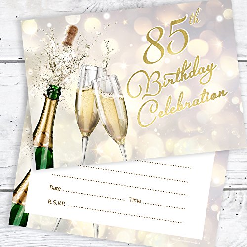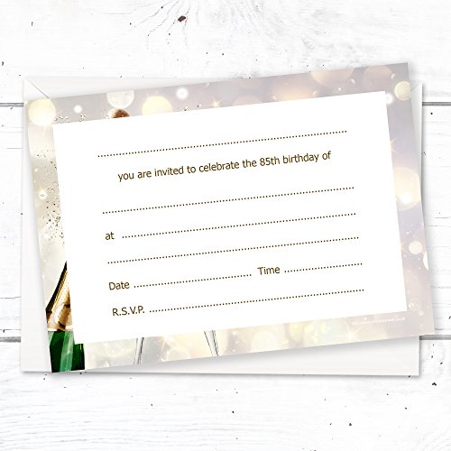 Packung mit 10 hochwertigen Einladungen zum 85. Geburtstag im Champagner-Stil ✩ A6 Größe (105 mm x 148 mm) ✩ Professionell bedruckt auf beiden Seiten ✩ Lieferung mit weißen Umschlägen