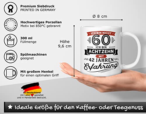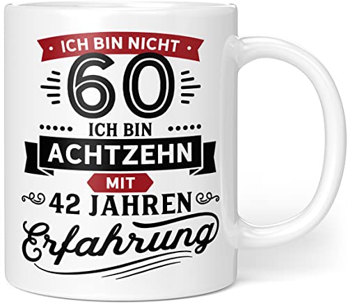 Geschenk Geburtstag 60 Tasse mit Spruch „Ich bin nicht 60 Ich bin 18 mit 42 Jahren Erfahrung“ – Porzellan Weiß 300ml