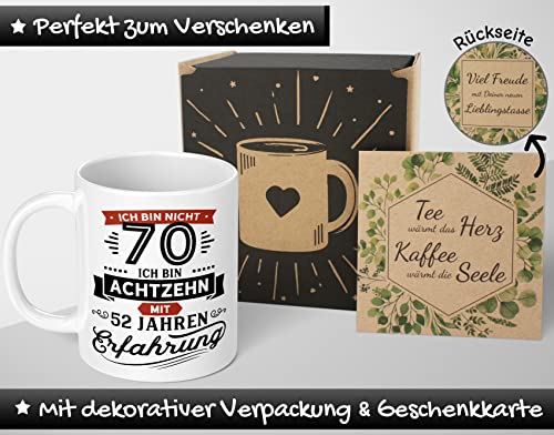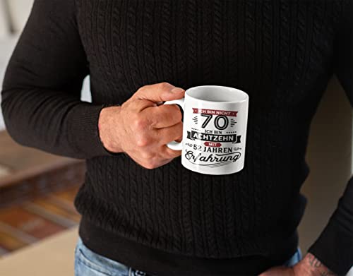 Geschenk Geburtstag 70 Tasse mit Spruch „Ich bin nicht 70 Ich bin 18 mit 52 Jahren Erfahrung“ – Porzellan Weiß 300ml