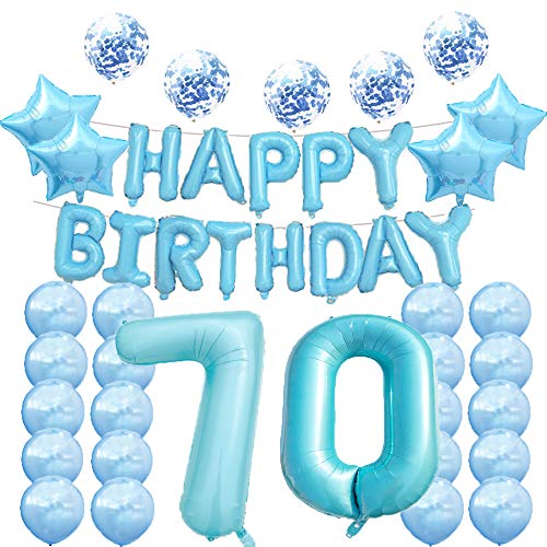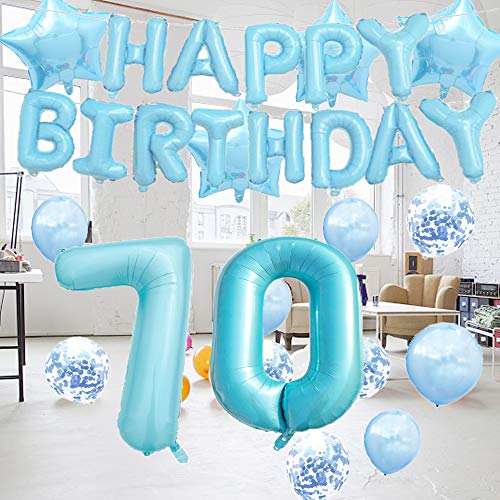 Lieferumfang: 101,6 cm blaue Folienballons „70“ Set, 16 „Happy Birthday Day“ Bannerballons, 4 Stück 45,7 cm Mylar-Sternballons, 5 Stück Konfetti-Ballons und 20 Stück blaue Latex-Ballons