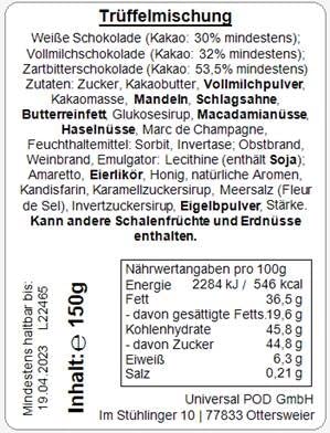 - Inhalt 150g: 12 Trüffel (Weißer Mandel-Nougat, Marc de Champagne*, Mandel-Amaretto*, Crème Brulée, Karamell-Meersalz, Macadamia; *enthält Alkohol)
