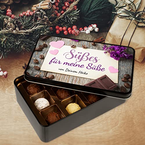 Diese schöne personalisierte Pralinendose mit Namen oder Wunschtext Süßes für meine Süße oder Süßes für meinen Süßen ist das ideale Geschenk zu Weihnachten für deine Lieblingsfrau, Freundin, Ehefrau oder für deinen Lieblingsmann, Freund, Ehemann. Schenke der Person, die dir am Herzen liegt, feinste Trüffel-Pralinen in einer individuell bedruckten Metalldose.