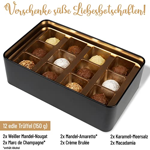 💝 In der personalisierten Pralinendose „Süßes für meine Süße“ oder „Süßes für meinen Süßen“ befinden sich 12 feinste handgefertigte Trüffel Pralinen in 6 leckeren Sorten: Weißer Mandel-Nougat, Marc de Champagne*, Mandel-Amaretto*, Crème Brulée, Karamell-Meersalz, Macadamia. Diese köstlichen Pralinen stammen aus einer Premium-Confiserie der deutschen Chocolatiers. (*enthält Alkohol)