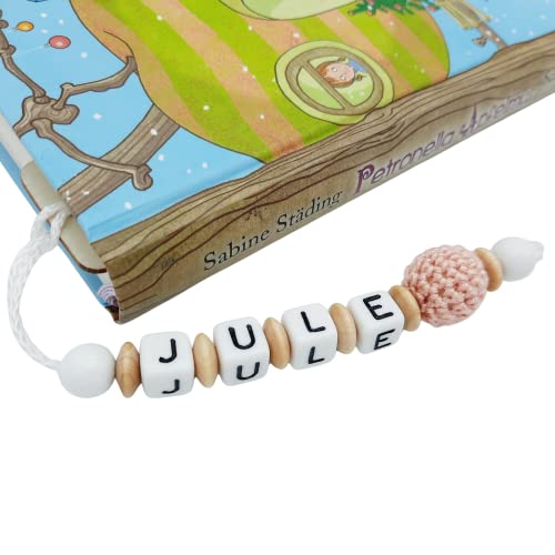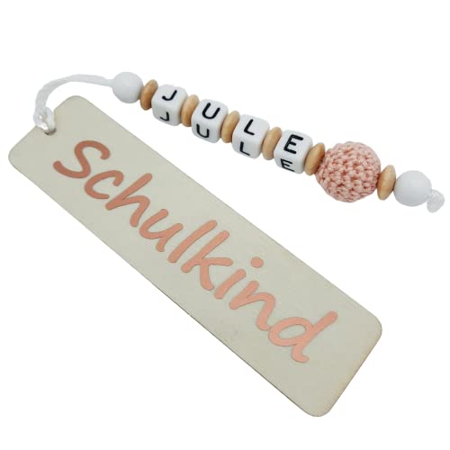 EIN Lesezeichen aus unbehandeltem Holz, mit fest aufgeklebter Aufschrift „Schulkind“(glänzende Vinylfolie). In den Farben: bronze/kupfer, dunkelgrau, pink und türkis Personalisiert mit Namen, wird diese Lesehilfe mit Kunststoffbuchstaben und Holzperlen, sowie einer Motivperle. Hier sind Farben und Motiv frei wählbar. Damit ist für jeden Schulanfänger das passende dabei, ob Fußball, Fee, Teddy, Stern, Traktor, Auto, Fuchs usw… Je nach Länge des Namens variiert damit natürlich die Länge des Anhängers und die Anzahl der Perlen! Auch Doppelnamen sind möglich, werden dann allerdings relativ lang, da die beiden Namen hintereinander aufgezogen werden. Das perfekte Geschenk zur Einschulung für alle Erstklässler, als Inhalt für die Schultüte oder Zuckertüte! Ein Must-Have für alle Erstleser und Leseratten! Jedes Stück ein absolutes Unikat!